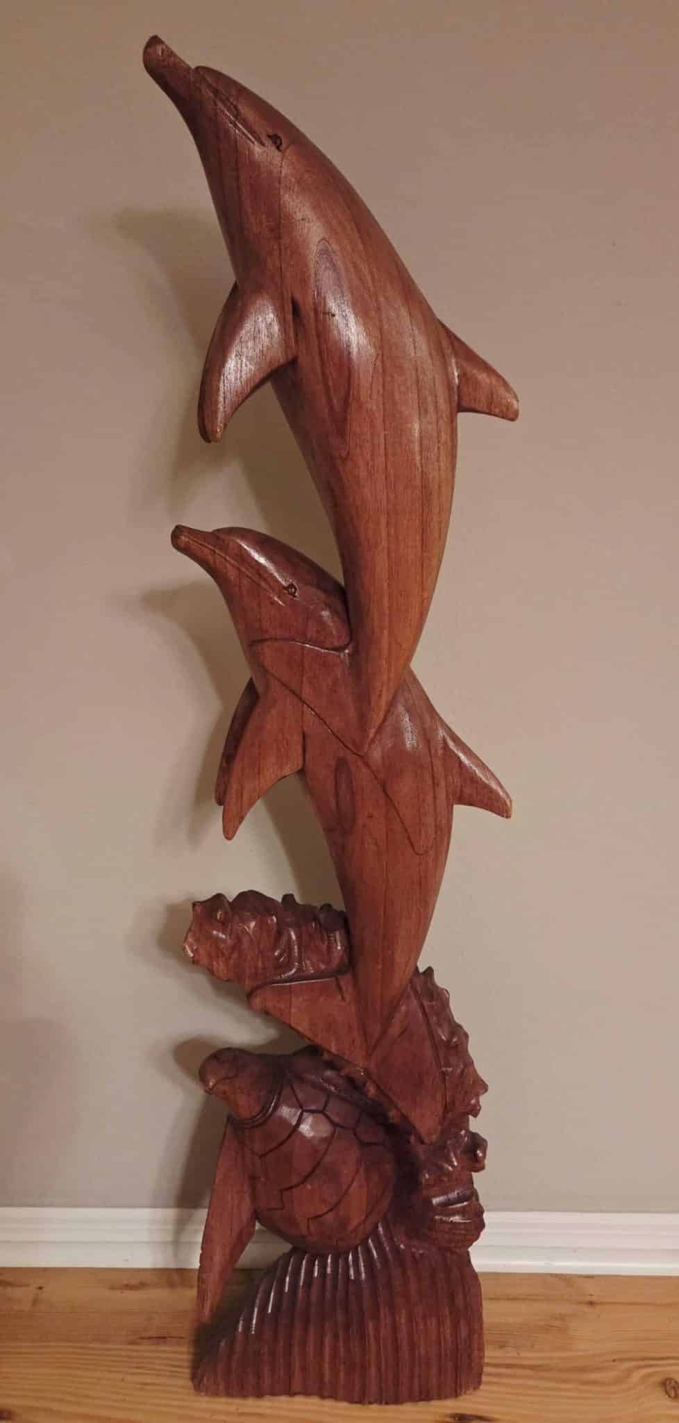Wooden Marine Life Sculpture – 2 Dolphins & Sea Turtle – 39 1/2″ Tall